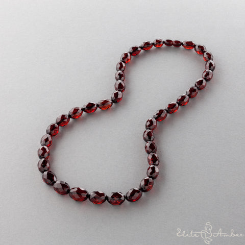 Necklace is made from natural Baltic amber. Color of bead is cherry. Diamond grinding, flat olive shape amber beads are threaded on cotton thread. The necklace fastens with a screw clasp.