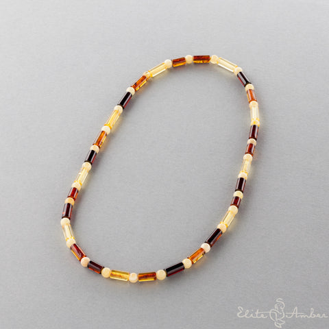Necklace is made from natural Baltic amber. Cherry and butterscotch colors fits perfectly. Cherry color cylinder shape amber beads and butterscotch round amber beads are threaded on cotton thread. The necklace fastens with a screw clasp.